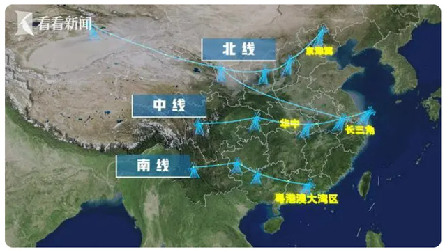 按照规划,“西电东送”形成了北、中、南三路送电格局,北线由内蒙古、陕西等省区向华北电网输电;中线由四川等省向华中、华东电网输电;南线由云南、贵州、广西等省区向华南输电。