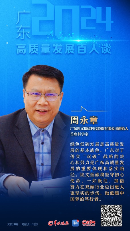 作为深耕“双碳”领域的科学家与企业家,周永章及其所在的埃文低碳团队一直致力于把低碳理念和研究成果转变为落地产品,服务国家的“双碳”目标和高质量发展。他表示,绿色低碳发展是高质量发展的基本底色,广东对于落实“双碳”目标的决心和努力是广东高质量发展的重要体现和落实路径。