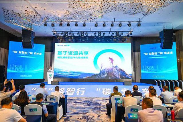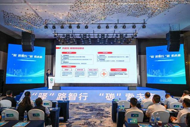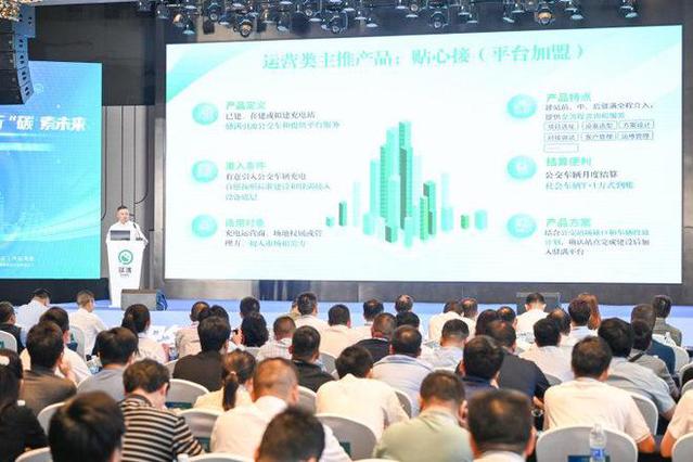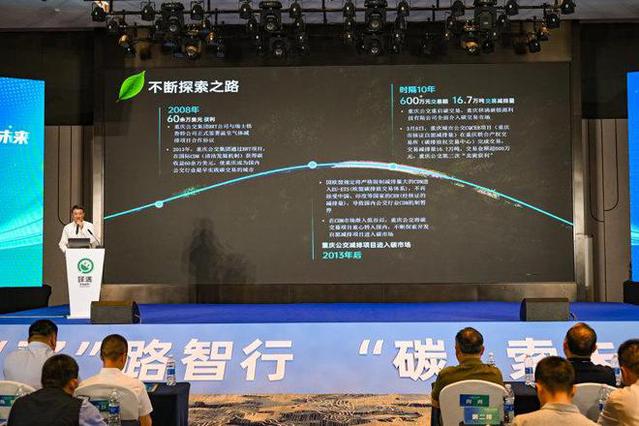市场开发部经理陈明震以《城市公共交通碳交易探索与思考》为题发言。重庆驿满新能源科技有限公司供图