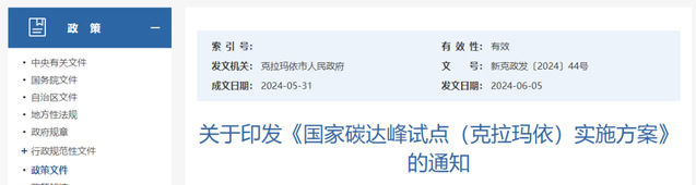 《国家碳达峰试点(克拉玛依)实施方案》由以油、煤、气等化石能源利用开发为主,向石化能源和氢能、风能、光能、生物质能等新能源综合开发利用转变。