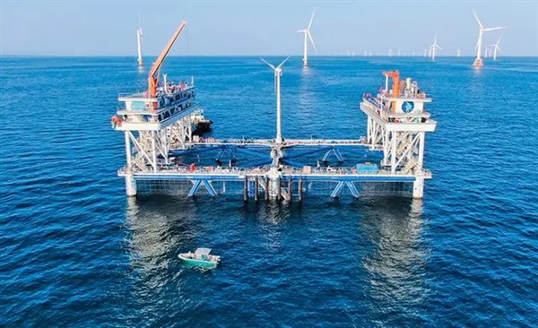 中广核“伏羲一号”是全部依靠绿色能源供能的大型风渔融合网箱平台,项目对于我国“海上风电 + 海洋牧场”产业融合发展具有重要示范意义。图为中广核“伏羲一号”风渔融合网箱平台(2024 年 9 月 2 日摄)邓华摄 / 本刊
