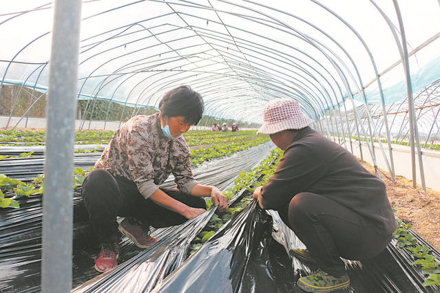 作为该合作社的“拳头”产品,草莓的种苗培育和入棚移栽、覆膜正在紧张进行中。在标准化草莓大棚里,处于旺盛生长期的草莓植株嫩绿可爱。工人正专心致志地摘除草莓老叶、仔细清除杂草,以防病虫害发生。