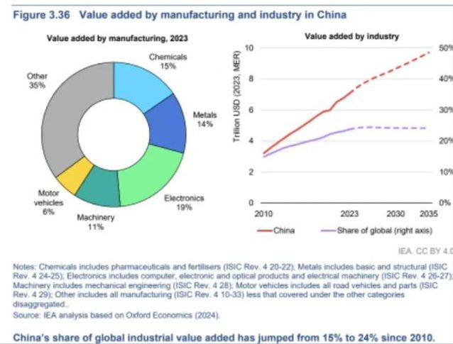 中国作为全球制造业的领军者,向其国内市场和全球其他国家供应大量各种制成品。自2010年起,工业领域,包括制造业、建筑业和采矿业,对中国经济增长的贡献率约为40%,目前占国内生产总值(GDP)的近40%。在2023年,仅化工、金属、电子、机械和汽车这五大行业为中国制造业贡献了超过一半的增加值(参见图3.36)。中国目前生产了全球超过一半的钢铁和铝,以及本报告关注的40%至95%的关键清洁技术和组件。中国大部分的工业扩张是在相对较短的时间内实现的:总体来看,2010年至2023年间,工业增加值增长了一倍以上,其在全球工业增加值中的比重也从15%增加到了24%。