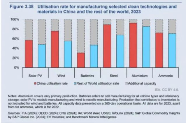 对于关键材料的产能利用率而言,几乎没有证据表明中国的产能利用率与世界其他地区存在显著差异。实际上,在某些情况下,中国的产能利用率甚至更高。根据经济合作与发展组织(OECD)钢铁委员会(负责监测全球钢铁行业过剩产能的机构)的官方产能数据和世界钢铁协会(World Steel Association)的产量数据,2023年中国钢铁厂的产能利用率达到了89%,这一数字比世界其他地区高出20个百分点。此外,中国的铝冶炼厂的产能利用率也略高,而根据国际贸易协会提供的类似数据,其氨气设施的产能利用率与世界其他地区相当。