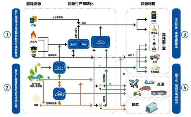工业部门是二氧化碳的排放大户,2020 年二氧化碳排放占全国总排放量的39%,主要包括钢铁、建材、化工、有色等领域。要实现这些领域的“双碳”目标,就必须对现有的工业流程进行低碳零碳再造。首先,通过深度电气化,利用非化石能源发电实现深度脱碳;其次,对于难以电气化的工业流程,需借助氢能、合成气/甲醇、二氧化碳等平台,通过技术突破和行业间的协调、融合实现低碳零碳流程再造,促进化石能源和二氧化碳的资源化利用,实现行业低碳零碳工艺革新。