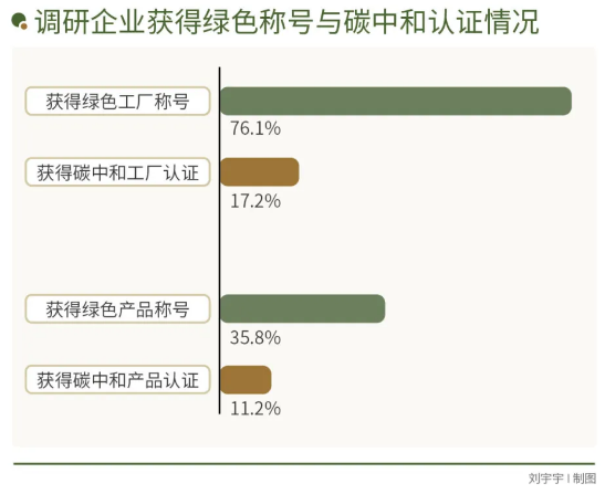 然而,与绿色工厂相比,中国企业打造“零碳工厂”“碳中和产品”仍处于探索阶段。17.2%的调研企业获得了碳中和工厂认证,11.2%的调研企业通过了“碳中和产品”认证。