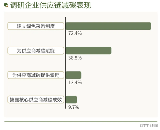 在调研的企业中,仅有38.8%的企业通过培训、知识交流、技术支持等为供应商减碳进行赋能,仅有13.4%的企业为供应商减碳提供商务合作或荣誉激励,仅有9.7%的企业披露了核心供应商的减碳成效。