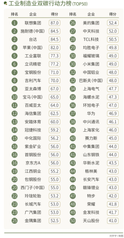 从调研结果来看,工业制造业双碳行动力仍处于“起步”阶段,得分60分及以上的企业仅有13家,占全部调研样本的7.6%;得分超过80分的企业有4家,分别为联想集团、施耐德(中国)、台达、苹果(中国)。
