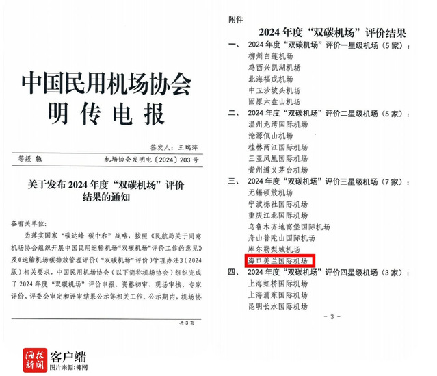商报全媒体讯 2024年12月5日,中国民用机场协会经过现场审核、专家评审、评审结果公示等环节,正式发布了2024年度“双碳机场”评价结果,海南控股旗下海口美兰国际机场(以下简称“美兰机场”)由二星级机场升至“双碳机场”评价三星级机场,成为海南自贸港首个获得“双碳机场”三星级认证的机场,标志着美兰机场绿色低碳工作迈入全新的高质量发展阶段。