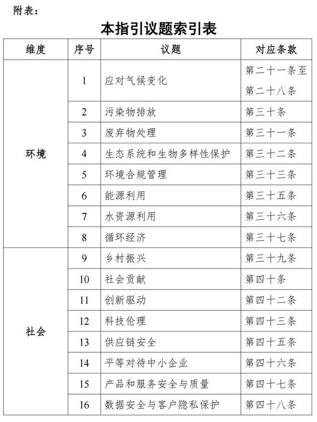 同时,对于不同议题,《指引》设置了差异化的披露要求。例如,针对气候变化,要求披露气候适应性、转型计划、温室气体排放总量、减排措施等信息;而对于员工权益保护,要求披露薪酬支付、社保缴纳、员工申诉制度等情况。