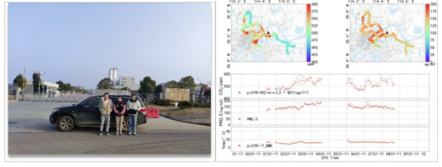 图2 武汉市CO2浓度的走航观测(左)与观测结果(右)