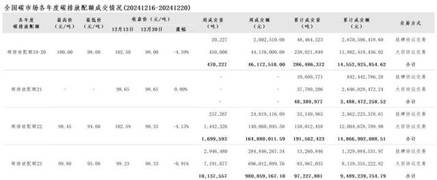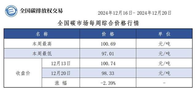【周报】全国碳市场每周综合价格行情及成交信息20241216-20241220