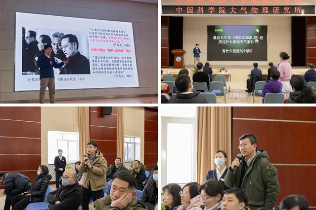 大气所弘扬科学家精神宣讲团成员魏科研究员以《气候危机时代生存指南》为题,为大家作了一场精彩的弘扬科学家精神科普报告。报告内容深入浅出,既涵盖了大气科学的基本原理,又涉及了气候变化的前沿研究,也详细阐述了竺可桢先生、叶笃正先生、陶诗言先生和曾庆存先生等老一辈科学家对气候变化研究做出的巨大贡献。从气候变化研究简史、气候系统的复杂性、气候科学的检测与归因,阐明了全球变暖将会导致海水和冰川融化、海平面上升、生态系统崩溃、生物多样性丧失、极端气候事件频发等生态连锁反应,为大家澄清了关于“全球变暖是骗局”等网络谣言,并指出解决这一千年之变气候难题的最终答案就是早日实现“碳达峰”和“碳中和”。现场提问环节气氛热烈,台上台下积极互动,魏科研究员用通俗易懂和幽默风趣的语言一一解答了大家的疑惑,取得了良好的效果。