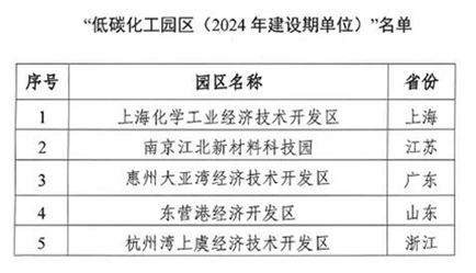 经自愿申报、文件审查、专家评审、网上公示等程序,评选出上海化学工业经济技术开发区、南京江北新材料科技园、惠州大亚湾经济技术开发区、东营港经济开发区、杭州湾上虞经济技术开发区等5家园区列入″低碳化工园区(2024年建设期单位)″。