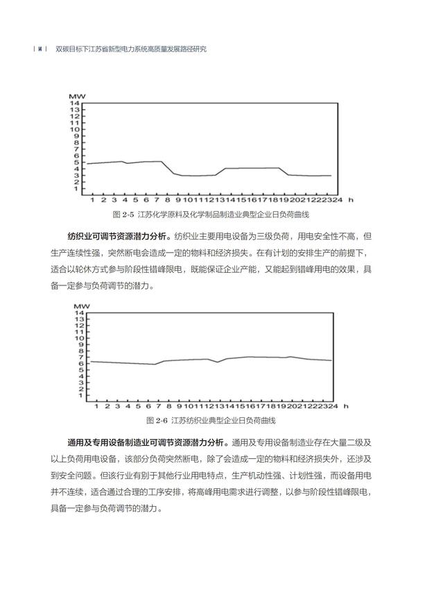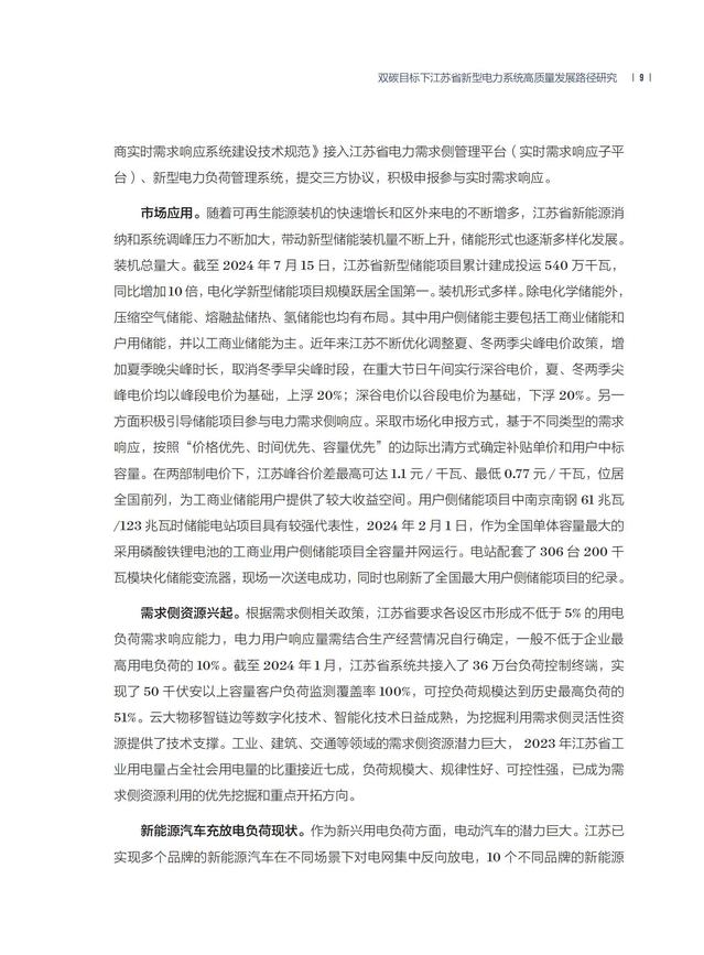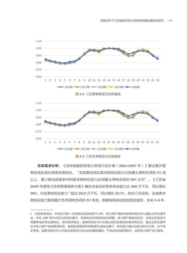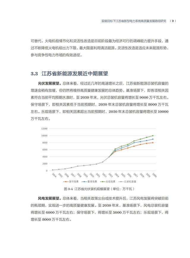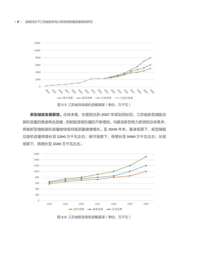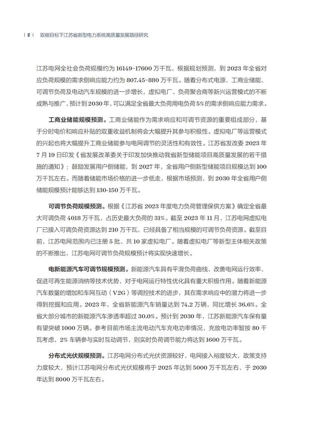 研究发现,江苏新型电力系统建设具备良好的基础,要建设“三新”新型电力系统,即供给结构新、系统形态新、运行模式新,相比与全国新型电力系统构建进程,江苏省新型电力系统建设预计超前5-10年完成。从需求侧来看,江苏具备较好的需求侧灵活性资源潜力,通过合理利用和优化配置需求侧灵活性资源,可以显著提升电力系统的灵活性和经济性,促进可再生能源的并网消纳,降低系统运行成本,实现绿色低碳发展目标。结合江苏实际,全省需求侧响应能力暂按最大负荷用电负荷的5%考虑,到2030年,江苏电网全社会负荷规模约为16149~17600万千瓦,对应的需求侧响应能力约为807.45~880万千瓦。从发电侧来看,江苏省新能源高质量发展面临资源制约因素凸显、并网消纳压力加大、电网安全运行承压、体制机制亟待创新等挑战。在乐观场景下,至2030年末,江苏省光伏总装机容量将增长至10000万千瓦左右,风电总装机容量将增长至8000万千瓦左右,新型储能总装机容量将增长至1500万千瓦左右。