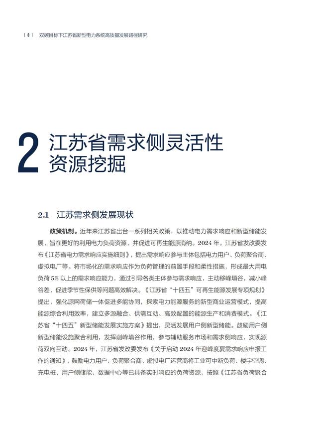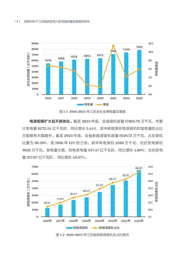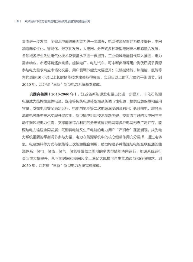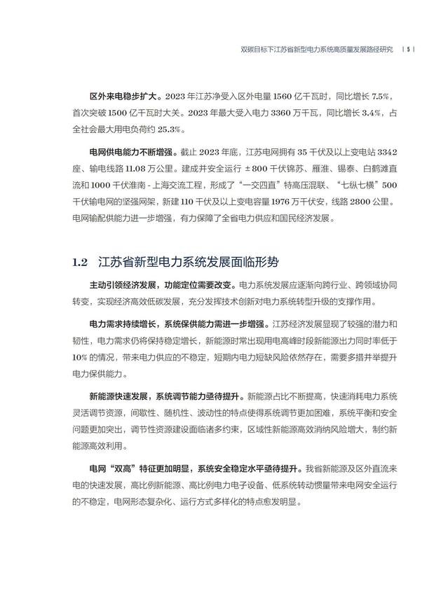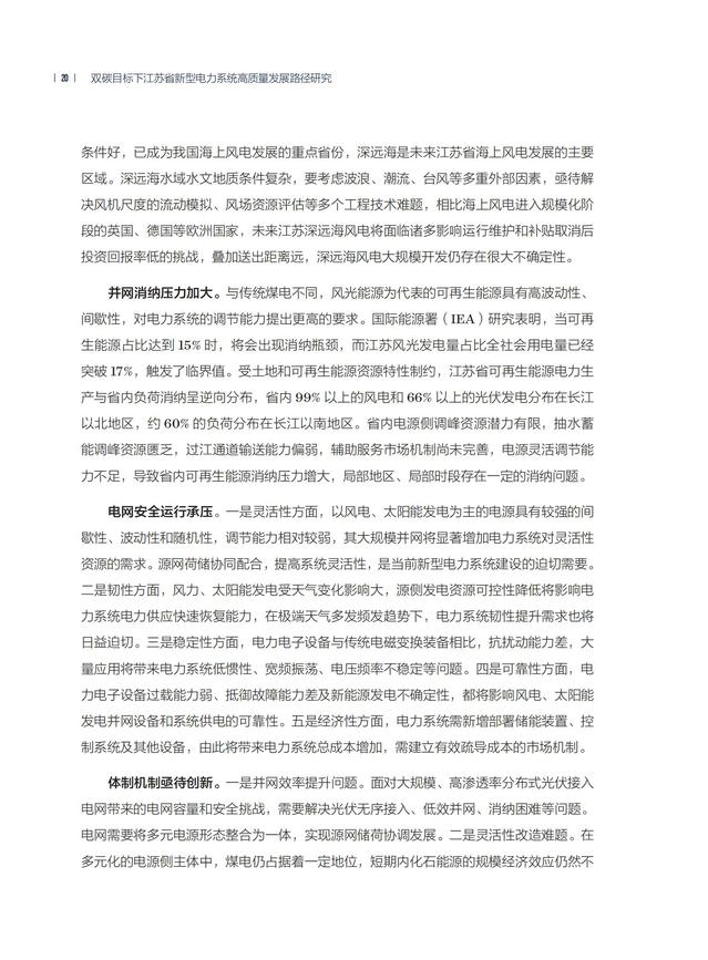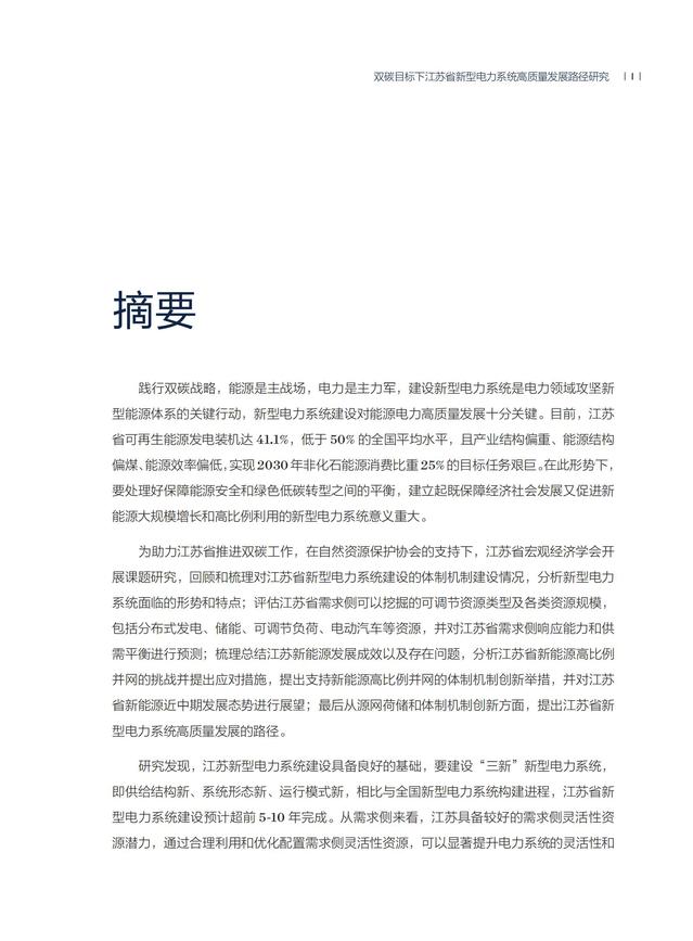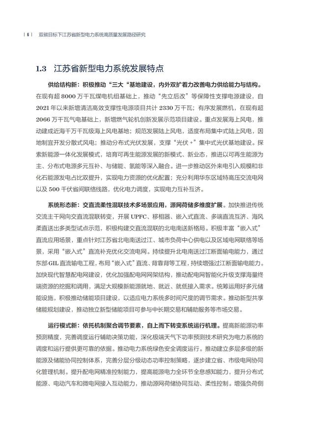 为助力江苏省推进双碳工作,在自然资源保护协会的支持下,江苏省宏观经济学会开展课题研究,回顾和梳理对江苏省新型电力系统建设的体制机制建设情况,分析新型电力系统面临的形势和特点;评估江苏省需求侧可以挖掘的可调节资源类型及各类资源规模,包括分布式发电、储能、可调节负荷、电动汽车等资源,并对江苏省需求侧响应能力和供需平衡进行预测;梳理总结江苏新能源发展成效以及存在问题,分析江苏省新能源高比例并网的挑战并提出应对措施,提出支持新能源高比例并网的体制机制创新举措,并对江苏省新能源近中期发展态势进行展望;最后从源网荷储和体制机制创新方面,提出江苏省新型电力系统高质量发展的路径。