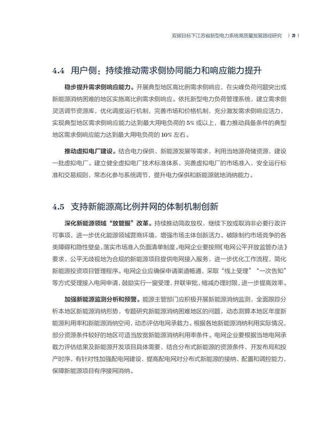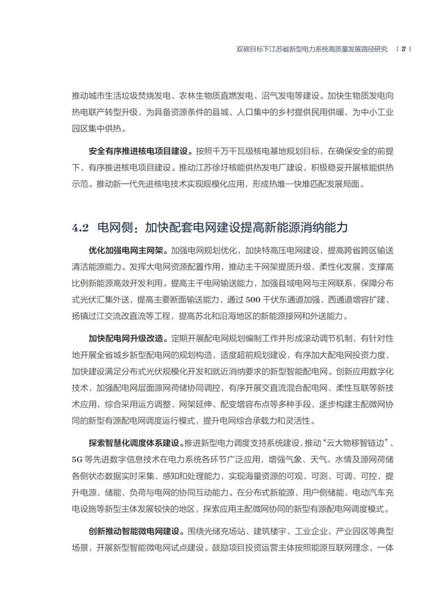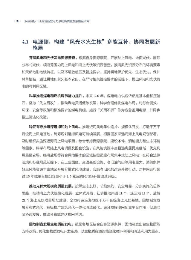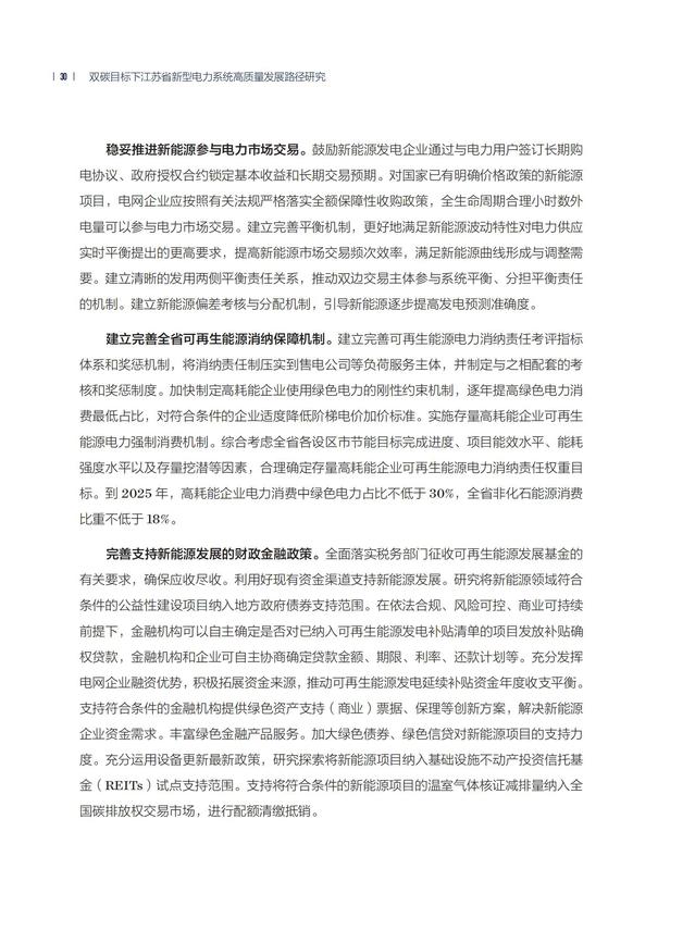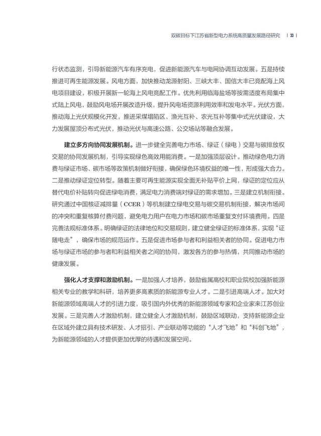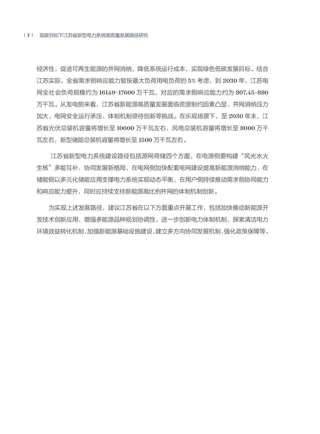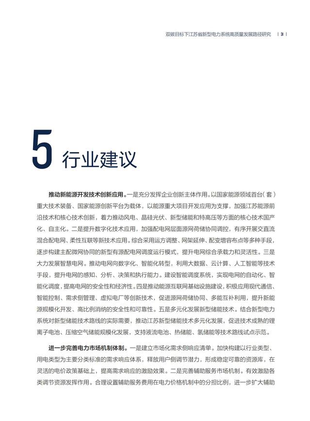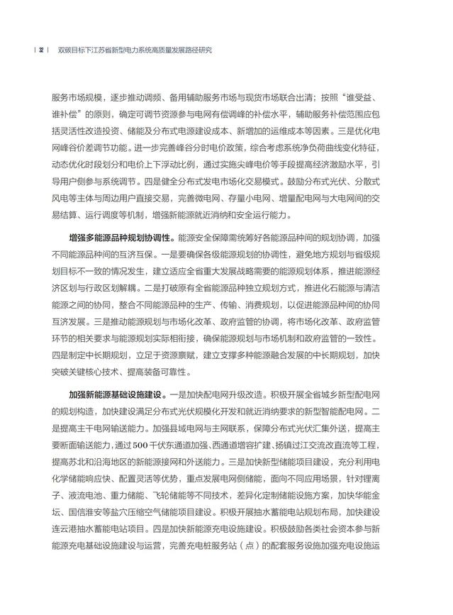 为实现上述发展路径,建议江苏省在以下方面重点开展工作,包括加快推动新能源开发技术创新应用、增强多能源品种规划协调性,进一步创新电力体制机制、探索清洁电力环境效益转化机制,加强新能源基础设施建设,建立多方向协同发展机制,强化政策保障等。
