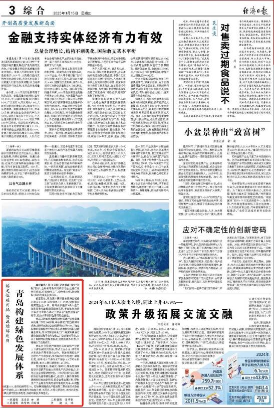 齐鲁网·闪电新闻1月15日讯 今天出版的《经济日报》03版以《锚定低碳目标 资源循环利用 青岛构建绿色发展体系》为题,关注山东省青岛市持续引导企业进行绿色化改造,打造绿色工厂、绿色供应链,构建低碳、循环的绿色发展体系。