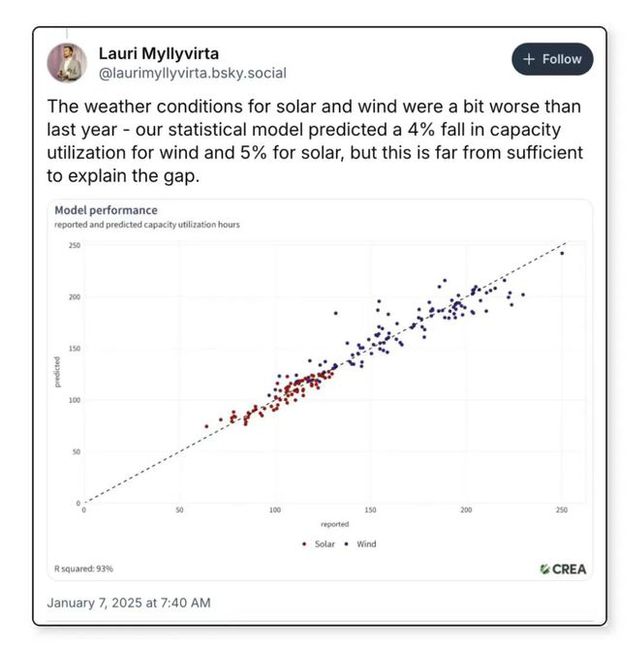 一个利用每日气象数据预测各省太阳能和风能发电设备利用率的统计模型,未能预测出 10 月和 11 月的发电设备利用率下降情况,也印证了天气并非发电设备利用率下降的主要原因。