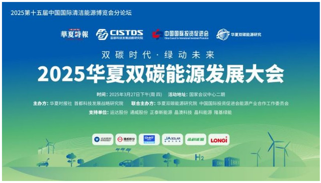 3月27日,第十五届中国国际清洁能源博览会分论坛——2025华夏双碳能源发展大会在北京国家会议中心圆满举办。本次大会以“双碳时代 绿动未来”为主题,由华夏时报社、首都科技发展战略研究院(CISTDS)主办,华夏双碳能源研究院、中国国际投资促进会能源与产业工作委员会联合主办,运达股份、通威股份、正泰新能源、晶澳科技、晶科能源、隆基绿能等众多龙头企业提供支持,另外还有双良节能、恒力石化、海博思创、派能科技、中天华氢、鲁丽集团、慧居科技、同辉能源等企业参与。