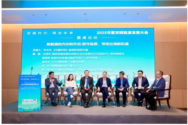 圆桌论坛环节,在华夏时报能源部主编李未来的主持下,国务院国资委机研院企业社会责任ESG促进中心欧洲部部长吕彦科、首都科技发展战略研究院ESG研究负责人高艳辉、中天氢能有限公司副总经理高浩华、同辉能源创始人兼CEO李栋、绿光气候研究院院长、中科化物液态阳光联合创始人舒玉莹、IVL瑞典环境科学研究院中国代表处碳中和与可持续发展中心主任王瑞就“新能源内功和外拓,坚守品质寻找出海新机遇”等话题进行了深度探讨。