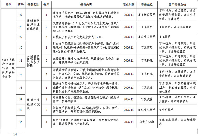 11.推进产业链协同发展。推进食用菌冷链物流、数字化产地仓建设,完善产品分选包装、烘干加工、冷冻储存、成品配送、销售供应和产品溯源等系统。启动蘑菇文化小镇建设,打造菌菇特色餐厅、健康体验馆、菌都公园等。创新食用菌场景应用,拓展菌菇观赏、科普、食用、药用等功能,开展菌菇进家庭等活动。探索“食用菌+休闲农业”等新模式,开发菌菇文创产品,推进菌菇文化产业发展。培育食用菌产品的消费群体,拓展食用菌产业市场的维度和广度。(市农业农村局牵头,市发改委、市工信局、市自然资源和规划局、市住建局、市文广旅局、市卫健委、市市场监管局等有关部门和单位按职能分工负责)