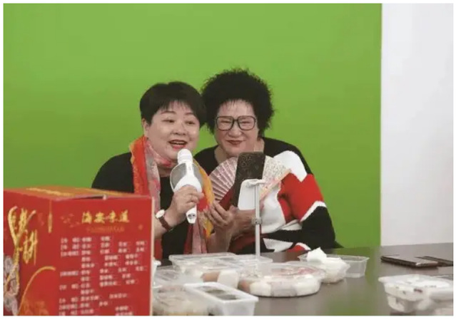 4月10日,肢体残疾人徐良云(左)在海安市扶残助农直播基地推销海安特产。