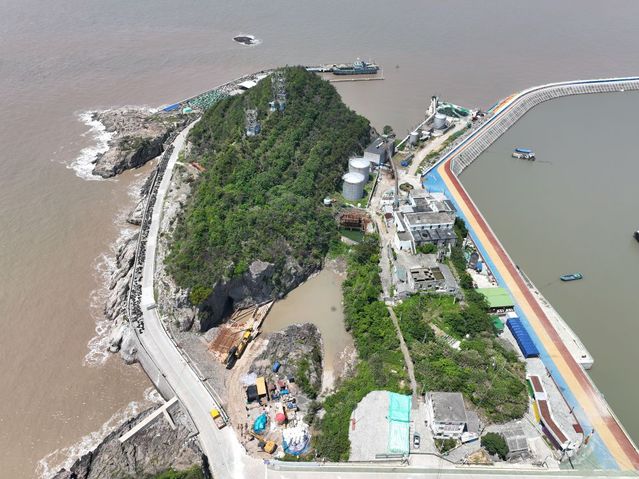 洞头区陆域引调水工程一期鹿西岛定向钻操作航拍。新华网发 温州市公用集团供图