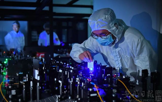 在科大硅谷片区内,工程师在观察多光子纠缠源系统的光斑形貌。程兆 摄