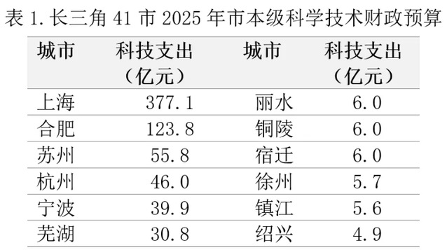 2025年,在长三角41个城市中,上海和合肥的市本级科技支出总量最高,分别达到377.1亿元和123.8亿,是长三角唯二科技预算破百亿的城市,其中,合肥市本级预算甚至超过安徽省级预算。
