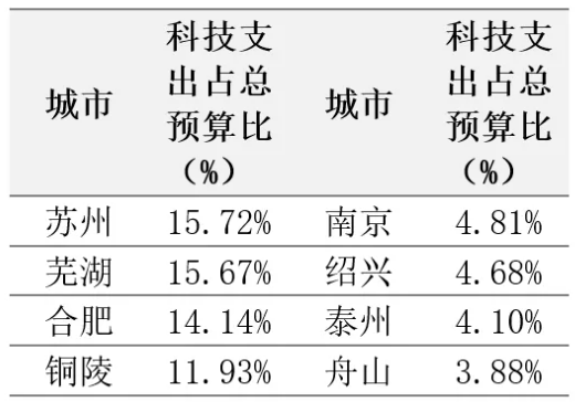 2025年,在长三角41个城市中,苏州、芜湖的科技支出占一般公共支出总预算比例最高,均超过15%(参考表3)。这意味着这两个城市对科技发展工作的重视程度很高。