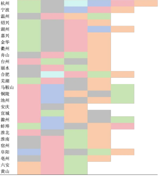 第二,在聚焦科技成果转化和应用研究的城市中,产业基础好的城市发挥“链主”优势,积极承接策源城市技术外溢,培养关键核心技术应用研究,努力让科技创新驱动产业升级;后发城市培养局部优势,积极融入长三角一体化发展(长三角41城创新战略参见附表2)。