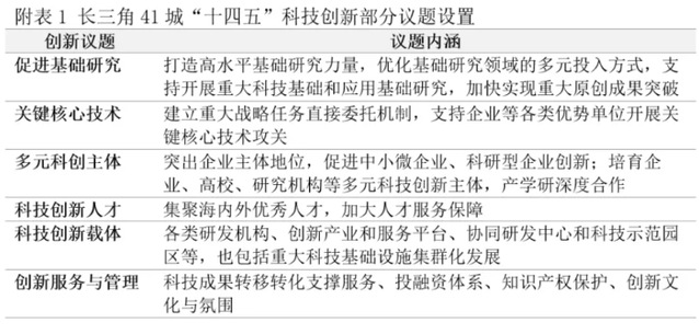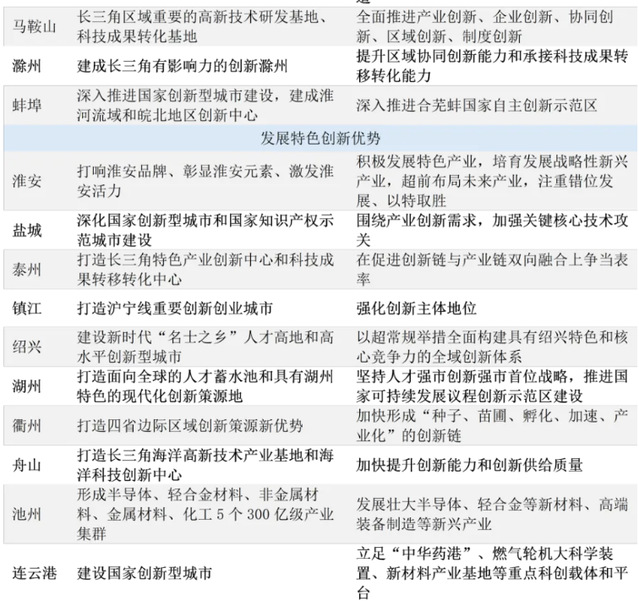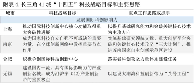 长三角41城的“十四五”规划显示(参见附表3和附表4),不同城市科技创新战略定位有两个特点。