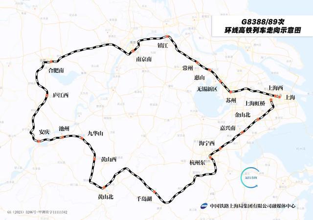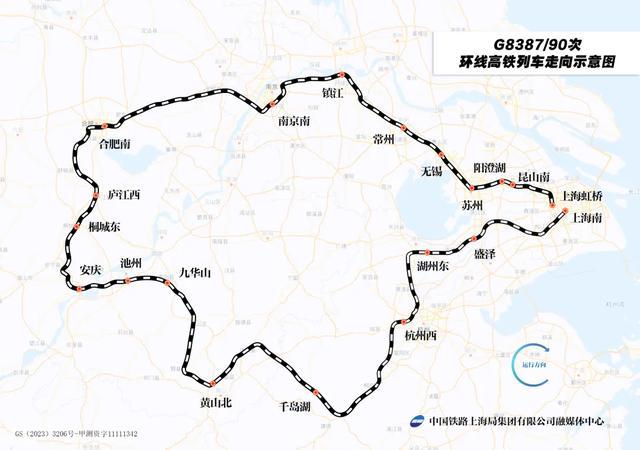 新图中,之前广受欢迎的“超级环线”高铁列车迎来双向开行。此次开行的上海南―上海虹桥G8387/90/87次“超级环线”高铁经沪苏湖高铁、合杭高铁、杭昌高铁、池黄高铁、宁安高铁、京港高铁、宁蓉高铁、沪宁城际等线路运行,全程约1320公里,旅时约8.4小时。