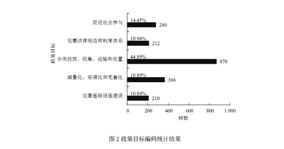 从频数统计结果来看(图2),分类投放、收集、运输和处置是地方政府最关注的政策目标, 共有 870 条, 占比 44.89%,其余 政策目标占比由高至低依次为减量化、资源化和无害化,促进社会参与,完善法律规范和制度体系以及完善基础设施,所占比重 分别为 18.89%、14.45%、10.94%和 10.84%。由此可见,作为生活垃圾分类的四个主要环节——分类投放、分类收集、分类运输 和分类处置,是当前政策目标的主要焦点;其次是“三化”,作为循环经济的基本原则, 指明了平衡经济发展与环境保护的方 向, 因此也被地方政府纳入政策目标考量范围,但关注度较生活垃圾分类的主要环节稍显不足;最后是完善基础设施、促进社会 参与、完善法律规范和制度体系等保障性政策目标,作为实现生活垃圾强制分类的重要支撑, 完善的基础设施是后续生活垃圾分 类得以推行的物质基础,促进社会参与能够提升生活垃圾分类实施的效率,健全的法律规范和制度体系则有利于形成可推广的 生活垃圾分类模式。但是从统计结果来看,这三类政策目标占比都不多。