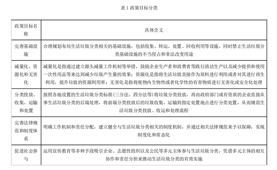 政策目标是指决策者希望通过实施政策所达到的效果与目的[20]。在查阅和分析相关政策文件及已有文献后, 做出以下思考: 生活垃圾分类处理设施是生活垃圾分类得以推行的物质前提,换言之,生活垃圾分类基础设施的完备度是影响生活垃圾分类效 果的重要因素[21]。因此,完善基础设施理应是生活垃圾分类政策考量的目标之一;固体废物防治应当坚持减量化、资源化和无害 化(简称“三化”)的原则[22],生活垃圾分类的纲领性文件中也有同样的表述,所以应当把“减量化、资源化和无害化”列为生活 垃圾分类政策的重要目标; 此外,生活垃圾分类处理是一个完整的生命周期,具体包括分类投放、分类收集、分类运输和分类处 置四个环节[23],基于过程视角,关注以上四个环节也属于生活垃圾分类政策的目标范畴; 当然,生活垃圾分类还离不开相关法律 法规和制度机制的保障,中央层面的政策文件提出要基本建立垃圾分类相关法律法规和标准体系[24],万筠和王佃利[25]也将贯彻 法律落实视作生活垃圾分类的政策目标之一,所以完善法律规范和制度体系也应当被视作政策目标之一;除此之外, 生活垃圾分 类政策的成功实施还需要形成全社会共同参与的良好氛围, 因此促进社会参与也应当被纳入目标考量。综上所述,本文生活垃圾 分类政策目标涵盖:完善基础设施建设, 减量化、资源化和无害化,分类投放、收集、运输和处置,完善法律规范和制度体系以 及促进社会参与五类政策目标(表1)。