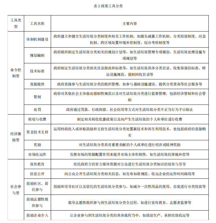 政策工具是政府用于实现政策目标的技术和手段[11]。英国公共政策学者 Rothwell & Zegveld[26]基于政策工具的产生着力面 及影响领域将政策工具划分为供给型、需求型和环境型三类。豪利特和拉米什[27]则根据政府介入公共物品与服务提供的程度高 低, 将政策工具划分为强制型工具、混合型工具和自愿型工具。具体到与生活垃圾分类相关的环境治理政策工具,张坤民等[28]将 中国常用的环境保护政策手段总结为命令—控制手段、市场经济手段、自愿行动和公众参与四大类。赵玉民等[29]将环境政策工具 划分为显性工具和隐性工具,其中显性工具包括命令控制型工具、市场激励型工具和自愿型工具,隐性工具则是指环保思想、观 念、态度等。在进一步参考相关文献[30,31,32]的基础上, 本文决定采用命令控制型、经济激励型和社会参与型的三分法对生活垃圾 分类政策工具进行划分,如表 2 所示。其中,命令控制型政策工具是指政府凭借公共权力实施的一系列具有强规范性和约束力的举措,具体到生活垃圾分类政策,则体现为体制机制建设、规划编制、技术标准、直接提供、管制和处罚等手段。经济激励型政 策工具致力于通过经济杠杆制约和调节利益相关者的行为以实现政策目标,该类政策工具相较命令控制型工具更为间接, 本文 将其细分为税收与收费、资金技术支持、奖励以及市场化运作四小类。社会参与型政策工具则强调非强制性,侧重从观念、态度 和素养等主观层面激发各行为主体的能动性进而实现政策目标,在生活垃圾分类政策中, 这类政策工具包括宣传教育,信息公 开, 鼓励社区、居民参与, 鼓励志愿性组织参与和鼓励企业介入。