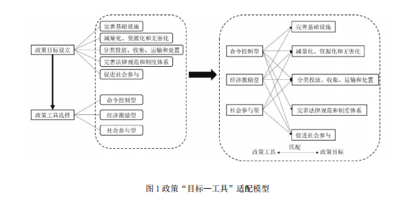 元治理理论对于我国生活垃圾分类治理的实践具有较强的解释力和指导意义。按照该理论,构建由政府主导的多元共治的 生活垃圾分类治理体系是生活垃圾强制分类时代的较优解。一方面,环境与经济并非非此即彼的“零和博弈”,我国正倡导“创新、协调、绿色、开放、共享”的新发展理念,竭力推进“资源节约型、环境友好型”两型社会的建设,生活垃圾分类处理顺应 这一潮流,必然也离不开政府提供的制度和物质资源的支持。另一方面,治理包括生活垃圾问题在内的公共问题,需要建立一个 由政府主导的多元共治的治理新范式。在这一新范式下,片面关注政府直接作用的命令控制型等直接性政策工具的局面应当被 扭转,经济激励型和社会参与型等间接性政策工具应引起决策者的关注。相较直接性政策工具,间接性政策工具借助于政策网 络, 通过政府和非政府部门的合作来实现,有助于降低政府的财政支出,增加政策工具的民主性与科学性。当然, 这并非意味着 对直接性政策工具的完全否定,扩大间接性政策工具的使用范围是以有选择地保留直接性政策工具的使用为前提的[18]。此外,政 策目标决定政策工具, 不同类型的政策工具在实现不同类型的政策目标方面亦存在效能差异。就完善基础设施而言,其公共产品 属性决定了政府必须发挥主导作用, 从而避免“公共地悲剧”的发生; 但基础设施建设具有投入大、周期长和风险高等特点,仅 凭政府财政资金注入绝非长久之计,因而需要运用经济激励型政策工具以激发市场主体的积极性,通过公私合作来保障建设效 率。 “减量化、资源化和无害化”目标的实现, 一方面需要政府方的政策法律予以保障, 打击偏离“三化”目标的不当行为;另 一方面也须尊重市场主体逐利的客观事实,通过经济杠杆引导企业自发地践行循环经济的理念,推行清洁生产。同时,公民作为 生活垃圾的主要产生者,需要通过宣传教育等社会参与型工具潜移默化地引导其养成绿色消费习惯。第三是“分类投放、收集、 运输和处置”目标,这一目标首先应当依赖于经济激励型政策工具的作用,通过激发市场主体的内生动力来更好地完善垃圾分 类的整体收运流程,其中,税收与收费可以借助经济激励和使用者付费的形式提升参与主体的积极性和责任感。社会参与型政策 工具也是必不可少的,通过社区和居民的主动分类投放来提升正确投放率,发挥志愿性组织的志愿监督力量来纠正垃圾分类不 当行为, 能够极大地减轻分类流程的压力。此外,鉴于市场存在失灵的可能性, 还需要直接提供、管制和处罚等命令控制型政策 工具提供“兜底”保障。最后是“完善法律规范和制度体系”和“促进社会参与”两大政策目标。其中,法律规范和制度体系的 建立与完善依赖于政府部门的公共权力和强制性资源,因而命令控制型政策工具是实现该政策目标的最直接手段。“促进社会 参与”依赖于宣传教育、信息公开和鼓励等社会参与型工具塑造其正确的认知; 同时,基于“经济人”假设,给予适当的经济激 励可以提升公民参与生活垃圾分类的动力;然而,仅凭激励性措施无法建构社区居民的义务性观念,社会主体往往存在“意愿” 与“行为”的背离,因此, 采用命令控制型政策工具对社会主体生活垃圾分类不当行为进行有效督促和惩处也是推动生活垃圾 分类工作的重要基础[33]。综上, 本文构建以下“ 目标—工具”适配模型(图 1)。