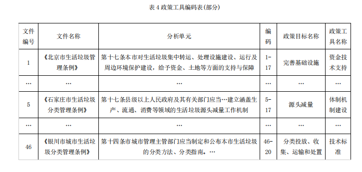 本文拟确定的分析单元为政策文本中有关于生活垃圾分类的具体举措,即最终遴选的 46 份政策文本的具体条目内容。如《北 京市生活垃圾管理条例》共有四章七十八条,除第一章总则和最后一章附则外, 需要对每一条目进行分析。本文按照“政策编号 — (章节或部分)—具体条款”的顺序进行分析单元的编码, 再结合政策目标和政策工具分类表,确定最终的分析单元。如 “1- 17”就代表编号为 1 的政策文本中的第 7 条内容, 其余编码以此类推。政策文本的具体编码参见表 4。