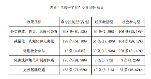 本文基于“ 目标—工具”适配模型,将其与当前地方生活垃圾分类政策“ 目标—工具”交叉统计结果进行对比以检验二者 之间的匹配度。政策“目标—工具”的匹配度分析如下:首先是最受地方政府关注的“分类投放、收集、运输和处置”,应然状 态下该政策目标的实现要求以经济激励型和社会参与型政策工具为主,辅之以命令控制型政策工具。然而实际情况却是命令控 制型政策工具占比高达 80.23%,经济激励型和社会参与型政策工具仅占比 7.59%和 12.18%(表 6),可见该政策目标与工具存在 适配偏差。其次是“三化”目标,依据“ 目标—工具”适配模型,该目标有赖于政策工具的“三管齐下”,换言之,三类政策工 具的使用频率应相对均衡。但是当前三类政策工具结构略显失衡,与其他政策工具相比, 经济激励型政策工具的应用不足。就 “促进社会参与”目标而言,社会参与型和经济激励型政策工具有助于从认知和经济层面提升社会主体参与生活垃圾分类的动 力,但动力转化为实际行动还离不开命令控制型政策工具的规制。反观当前政策工具的选择,命令控制型政策工具占比仅为 4.64%, 其规制作用难以充分发挥。第四是“完善法律规范和制度体系”目标,命令控制型工具需要占据主导地位,这与该目标实际的政 策工具组合基本一致。最后是“完善基础设施”目标,生活垃圾分类设施属于公共物品范畴, 以政府直接提供为主、市场供给为 辅的模式是符合现实情境的,因此该政策目标和工具组合也较为匹配。此外,从政策工具效果来看,命令控制型政策工具虽然能 够直接作用于政策目标, 但除了在效果确定性上略占优势以外,在静态效率(即静态分配状况下的成本效率)以及环境质量改善 持续性两个维度上都明显弱于经济激励型和社会参与型政策工具[36] 。环境政策的选择不应该是非此即彼的选择,政策工具的混 合使用反而能够带来更佳的环境治理效果[35] 。综上所述, “完善法律规范和制度体系”和“完善基础设施”的政策工具选择具 有较强的合理性,但居于政策目标前三位的“分类投放、收集、运输和处置”“减量化、资源化和无害化”以及“促进社会参与” 与其政策工具选择均不相匹配。由此可见,当前 46 个重点城市的生活垃圾分类政策工具结构与当前主要的政策目标还不完全适配。