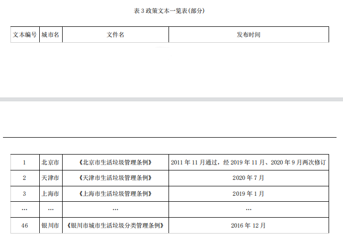 本文的研究样本为 46 个重点城市公开发布的旨在推进生活垃圾分类的政策文本。在选取样本时, 以政策效力、内容翔实、 时效、等量为筛选标准,其中政策效力是指选取地方政府发布的政策效力最高的文本,政策效力级别由高到低依次为:地方性法 规、地方政府规章、地方规范性文件和工作文件;内容翔实是指拟筛选的文本在内容上相较于其他文本更加详细和易于实施;时 效是指所选文本需为最新发布的且现行有效的文本;等量则是指一个城市只选取一份政策文本。当政策效力与时效两个原则发 生冲突时,优先考虑政策效力。为了保证所选政策文本的准确性, 本文所涉政策文本均来源于各地官方政府网站(表 3)。