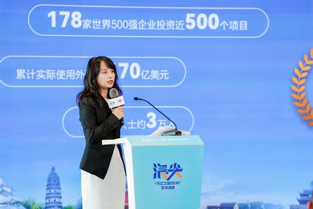 在万亿城市产业推介环节,合肥市投资促进局副县级干部王蓓、南通市商务局三级调研员姜伟、苏州市投促中心投促一处负责人唐逸恬先后分享城市产业发展亮点。
