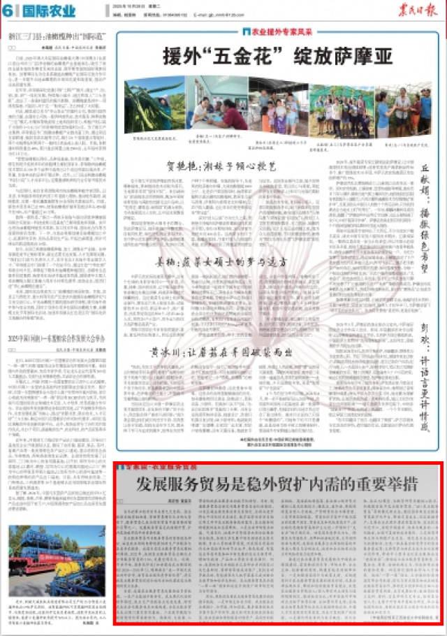 10月28日,《农民日报》刊登长三角零碳智慧乡村联盟联盟副理事长周应恒教授和硕士生黄宸宇的理论文章《发展服务贸易是稳外贸扩内需的重要举措》,该文深入学习党的二十届四中全会精神的最新理论成果。