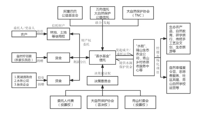 1.当地村民可以作为投资人并与“善水基金”签署信托合同,将林地承包经营权以财产权信托的方式,委托给“善水基金”集中管理(评估后确定其份额)。村民的身份也随之发生了两重变化:一是从单纯的生产者变为生态保护者,为弥补因为保护生态环境、放弃土地种植所造成的损失,村民每年可以从“善水基金”获得120%的生态补偿金;二是作为信托的投资者,签订信托合同的村民可以在信托结束后按照份额参与分红。2.其他机构、企业或公众个人也可以通过投资或者捐赠的形式参与信托。如果选择捐赠,其资产及所获得的分红将被永久存续(相当于公益投资);如果选择投资,无论是投入资产还是资金,都将按照资产评估价或出资额认定其信托份额,最后在信托结束之后按份额参与分红。3.组建决策委员会,由委托人代表(村民、企业、个人投资者等)、TNC和受托人代表(万向信托)组成,各方对资金使用、林地管理等重大决策拥有平等的投票权。为保证信托的公益性和所有决策符合生态保护目标,TNC拥有“一票否决权”,并作为信托的顾问,负责提供水源地保护模式设计、林地管理的专业化方案,以及评估保护效果、协调和整合公益资源等。4.成立市场经营主体,“善水基金”2015年出资10万元成立“水酷”公司,作为产业开发和市场运营的主体,依托于水源地下游生态产业收益的10%的资金反哺,用于支付信托的日常运营费用、村民林地承包经营权的生态补偿金、信托到期后的分红和水源地的日常保护管理费用等,推动形成可持续的生态补偿机制。