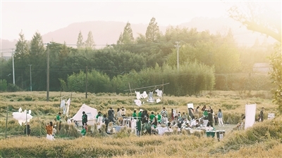 11月14日-15日,一场别具特色的“秋田宴”在余杭区黄湖镇青山村举行。本着“物尽其用,用食物着色食物,用自然装扮自然”的环保理念,一群年轻的设计师用旧衣物制作稻田装置艺术,用村民家借来的收割机、锄头、斧子、镰刀、竹篮、铁锅等农具装扮稻田,市集、演出与秋收同时展开……